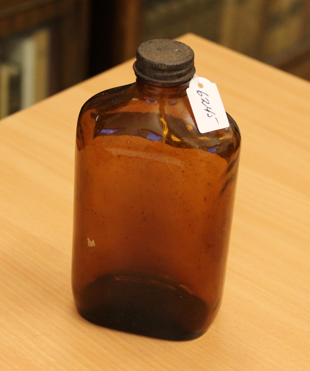 Peli úr brúnu gleri, 16 cm hár með skrúfuðum, svörtum járntappa.