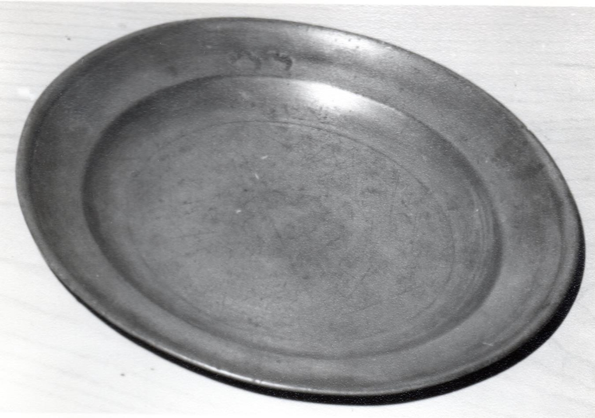 Tindiskur. Þvermál 22 cm. Á barmi disksins eru tvö merki, gætu verið mannsmyndir, í botni er hringur 13 cm, á bakhlið er krotaður stafur M. Diskurinn er úr búi Hákonar Jörundssonar sem bjó um 1850 að Birnhöfða í Borgarfjarðarsýslu. Sonardóttir hans Sesselja Jörundardóttir gaf mér.