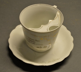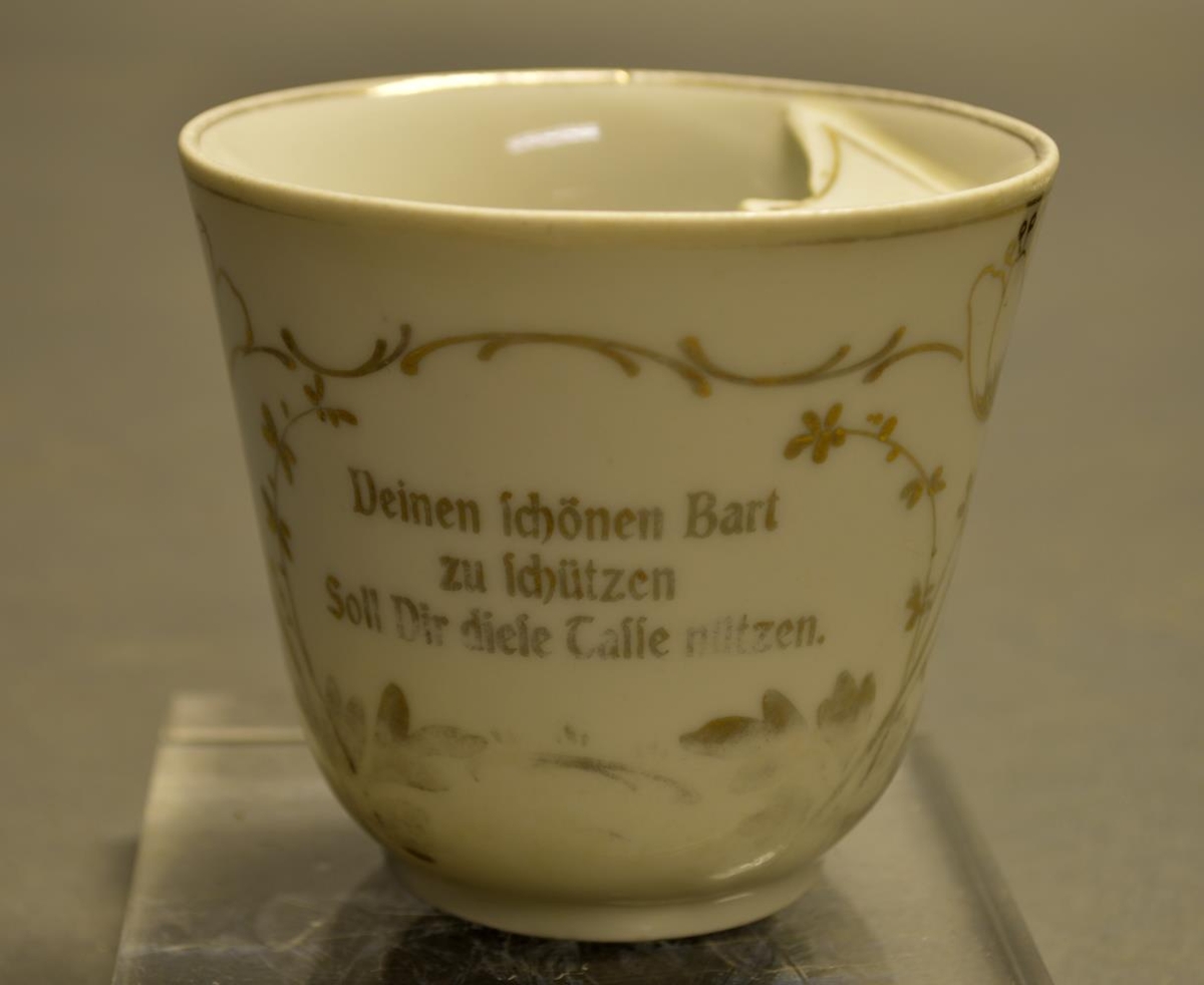 Skeggbolli úr postulíni með gylltum rósum og áletrun. Áletrun á þýsku: Deinen schönen Bart zu schutzen soll Dir diese Caffe mutzen. Bollann átti Túbal Karl Magnússon bóndi í Múlakoti Fljótshlíð. Soffía Túbals gaf Þórði Tómassyni bollann 10. 12. 1960.