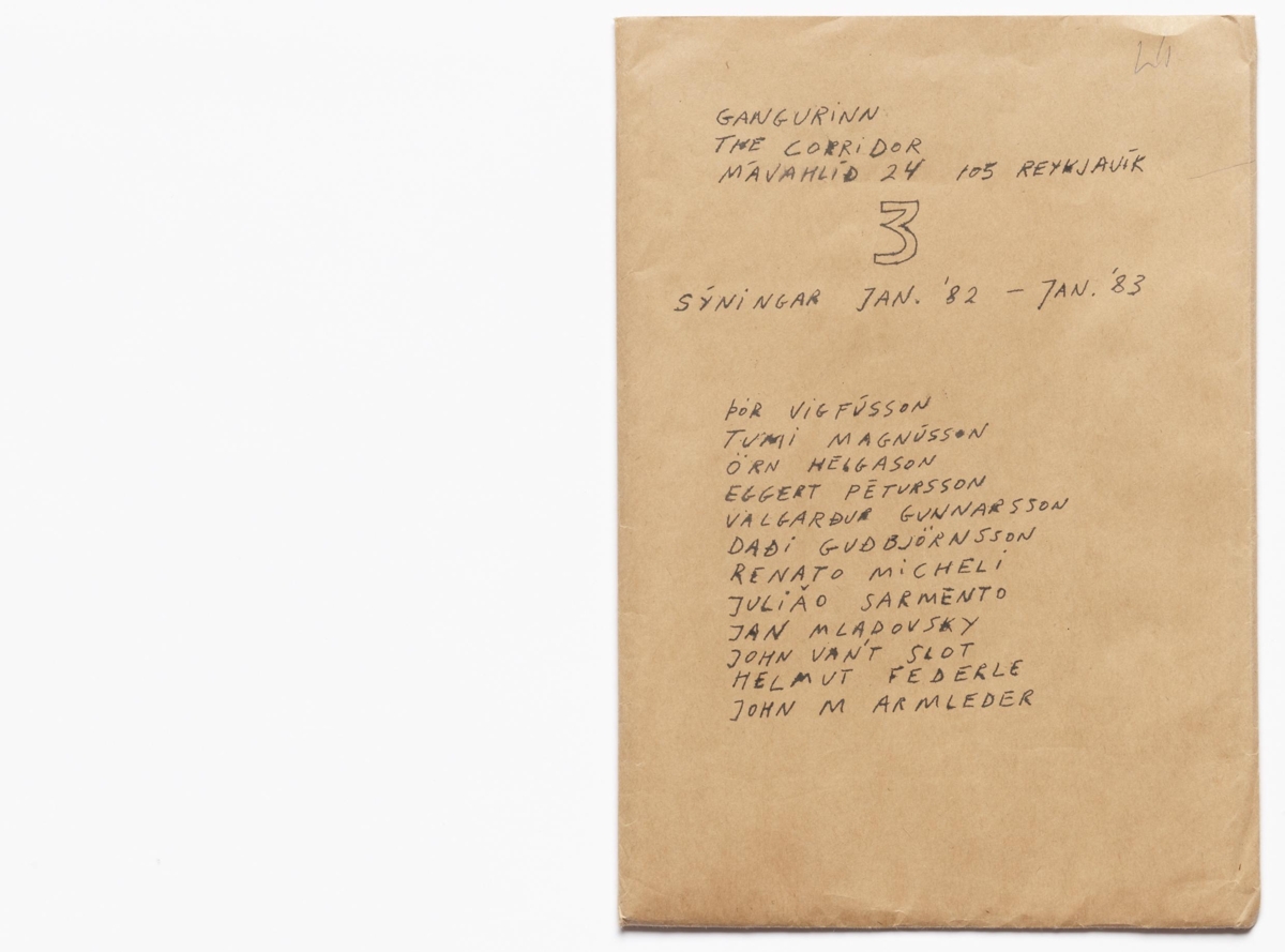 Verkið er 9 laus A4 blöð samanbrotin í umslagi með svarthvítt prentuðum ljósmyndum og teikningum, sum með prenti á báðum hliðum, sum með undirskrift eða handteikningu. Verk eftir 12 listamenn. Útgefið í tengslum við sýningar frá janúar 1982 til janúar 1983 í sýningarrýminu Gangurinn, rekið af Helga Þorgils Friðjónssyni. Upplag óþekkt.