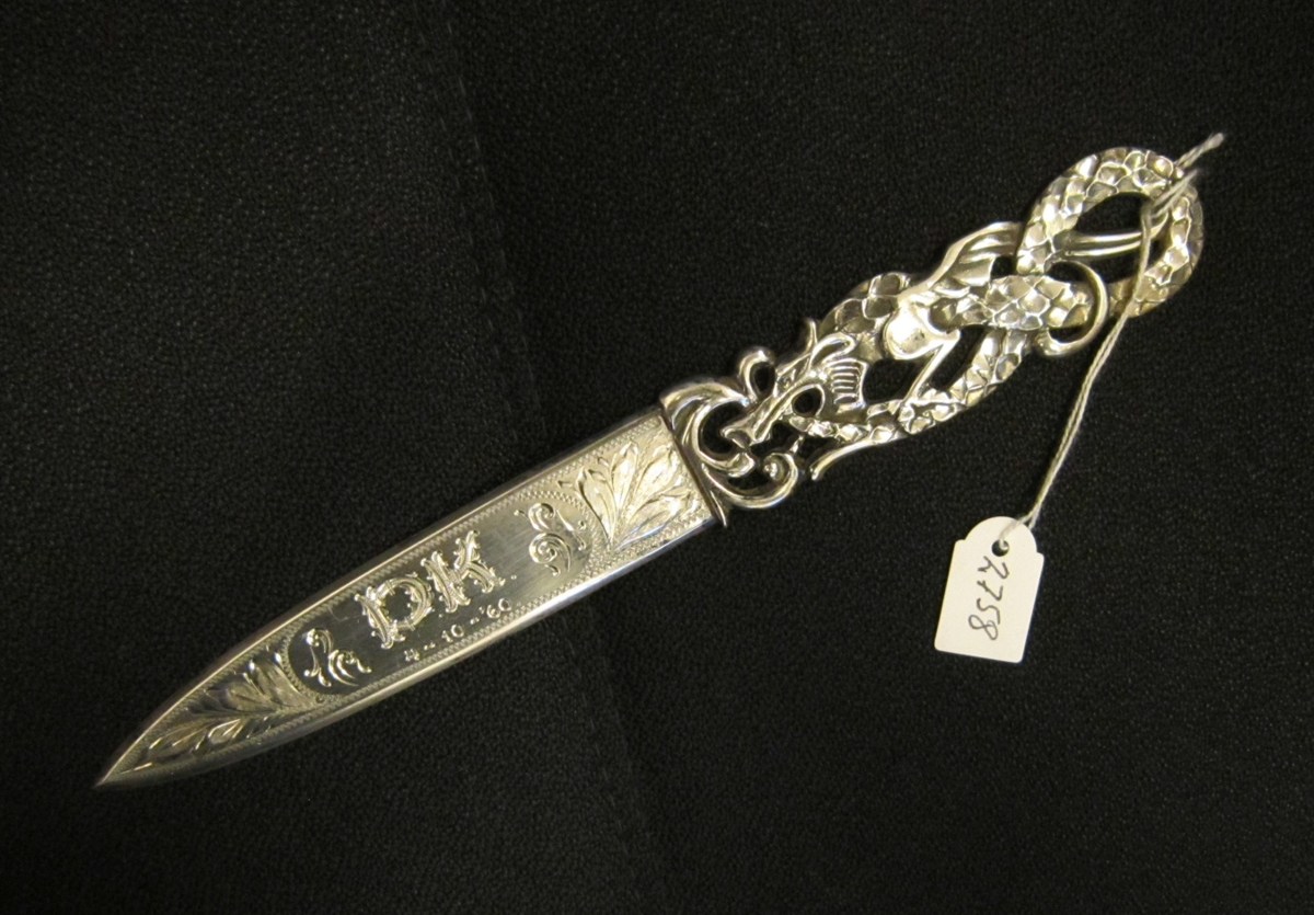 Blaðahnífur úr silfri með stöfunum Þ. K . 4-10-60. Þorsteinn Kristleifsson er fæddur 4/10 1890. Skaftið er í líki Miðgarðsorms, hnífurinn er 20 cm langur.