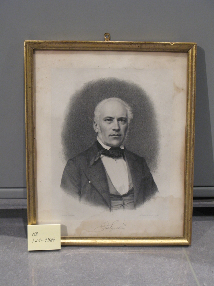 Ljósmynd af Jóni Sigurðssyni forseta. Á myndinni stendur; hth. eftir Potographi (í vinstra horni) (í hægra horni) I.W. Tegner og Kiffendorffs hth. Inst. Myndin í gylltum ramma. Handskrifað undir myndinni; Jón Sigurðsson.