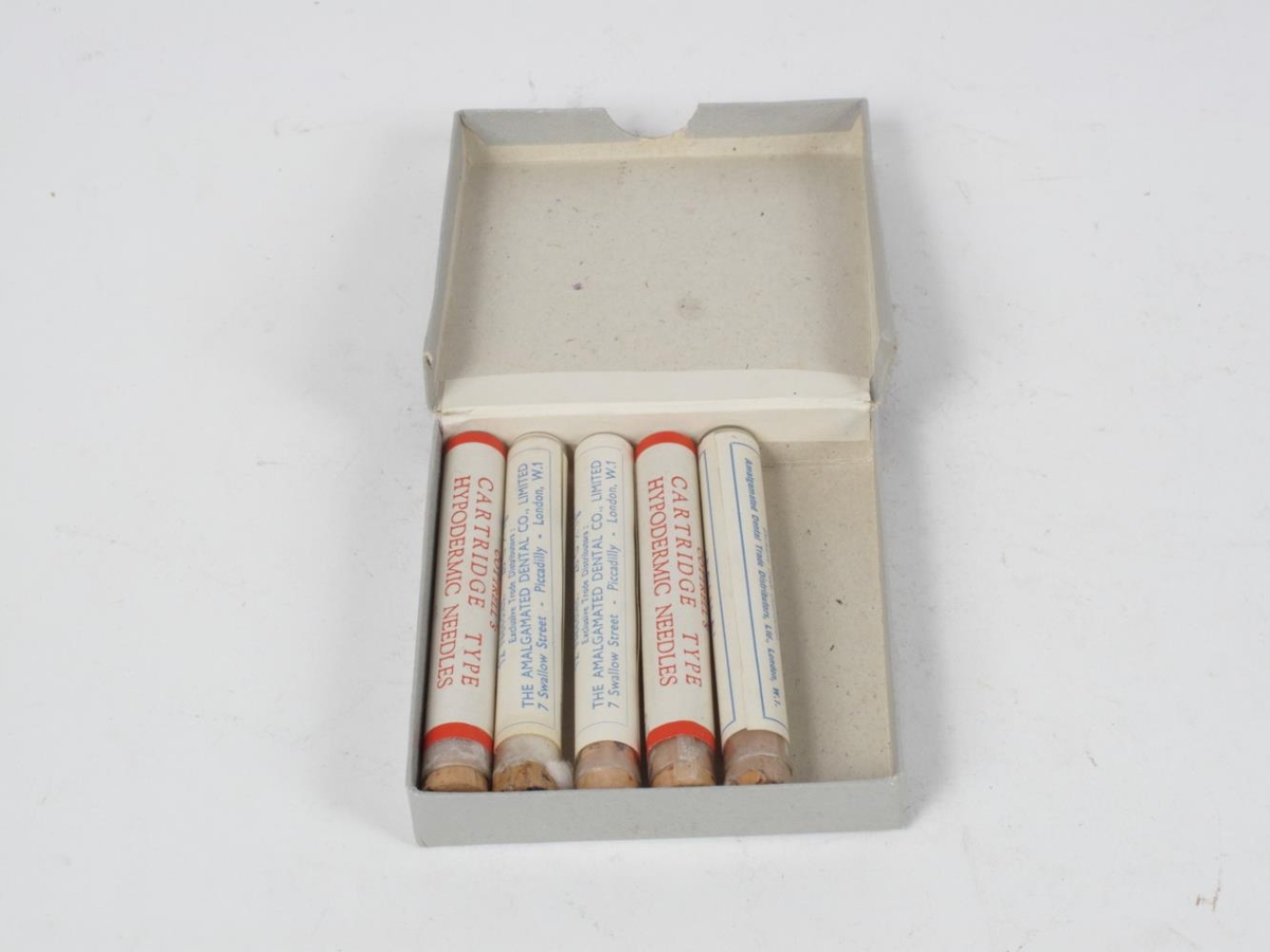 Pakki af sprautunálum. Nálarnar eru í 5 glerhylkjum, uphaflega voru 6 í pakkanum.