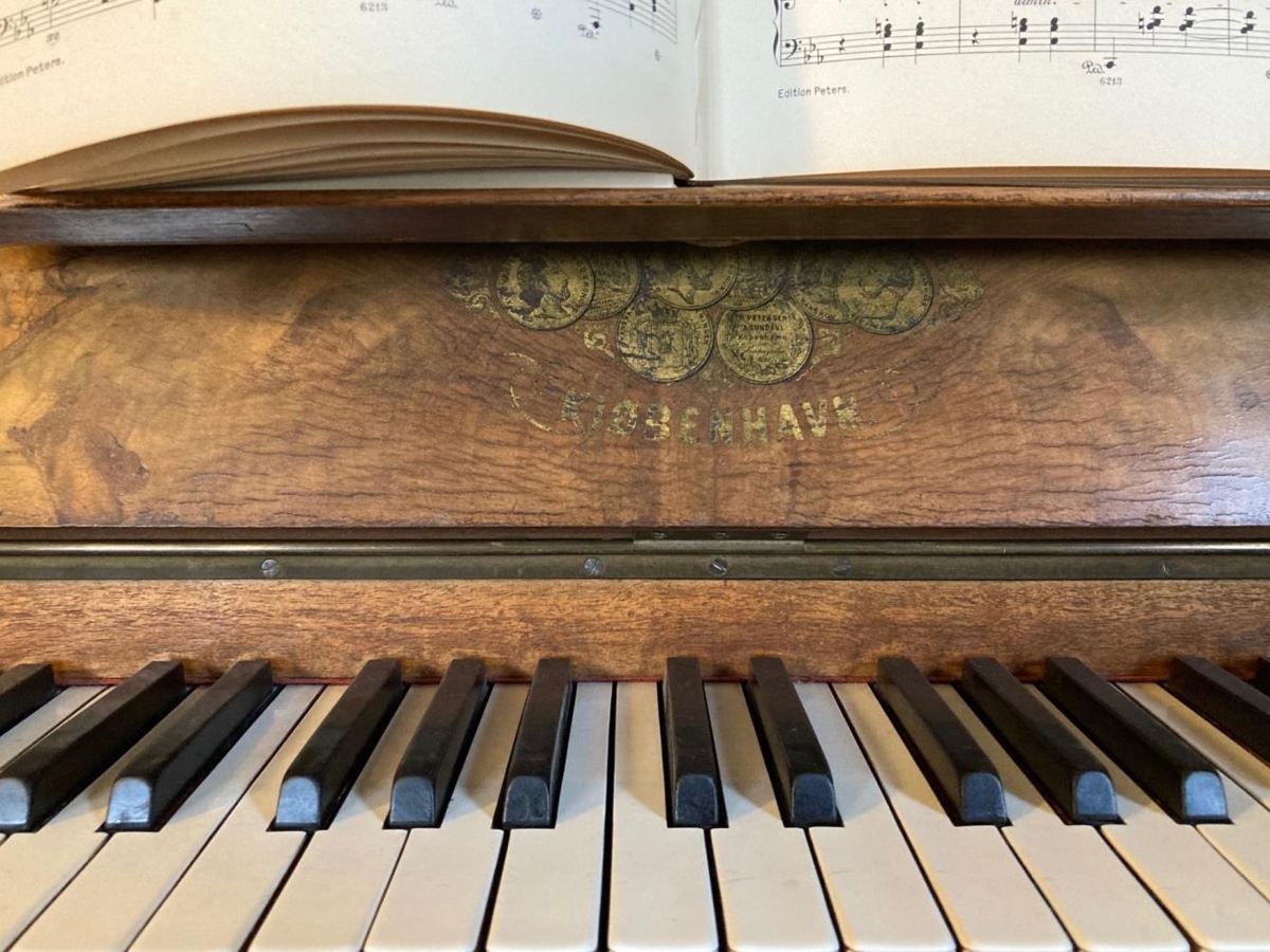 Píanó, vönduð smíði. Danskt, smíðað í Kaupmannahöfn. Tveir stólpar undir nótnaborði. Tveir málmstjakar.