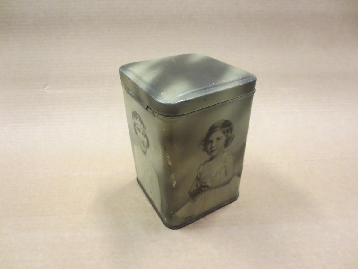 Kaffibox með myndum af breskri konungsfjölskyldu á hliðum: Georg VI, Elísabet og dæturnar Elísabet og Margrét.