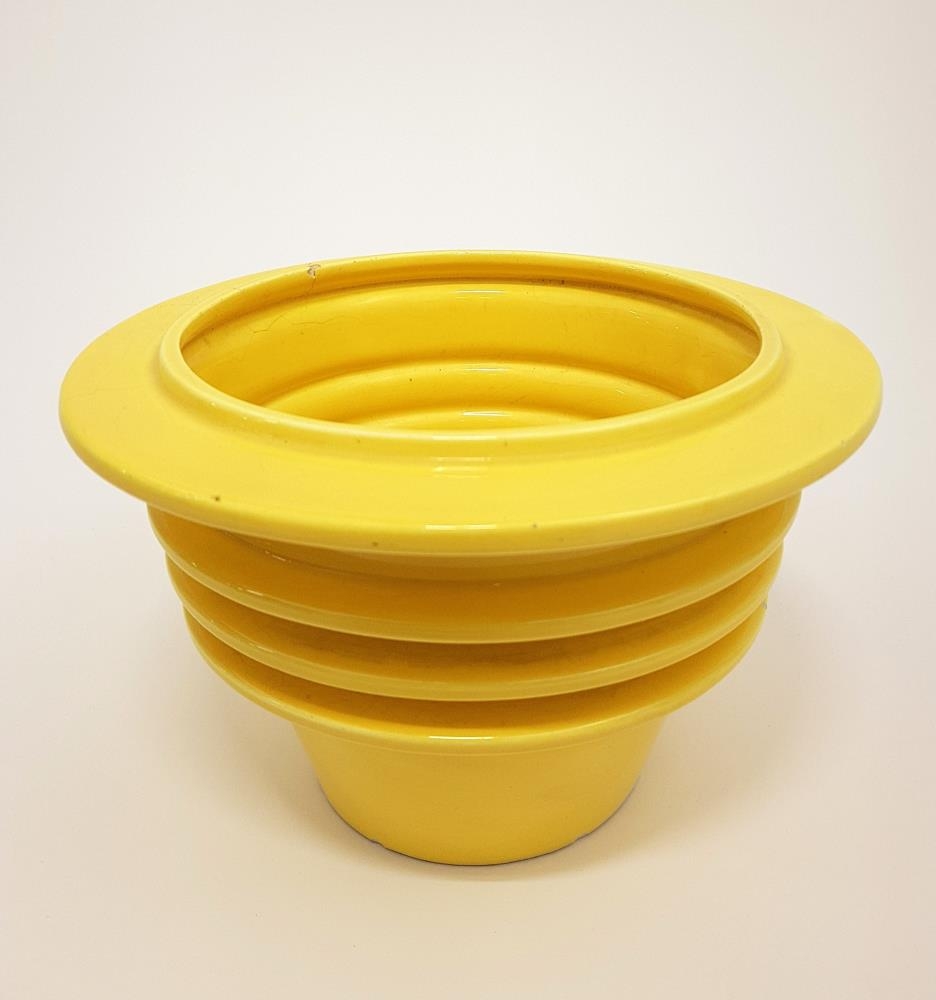 Blómahlíf úr eigu Önnu Þorkelsdóttur. Gulur blómapottur. Sprungur komnar í brún ofarlega en að öðru leyti lítur hann vel út.