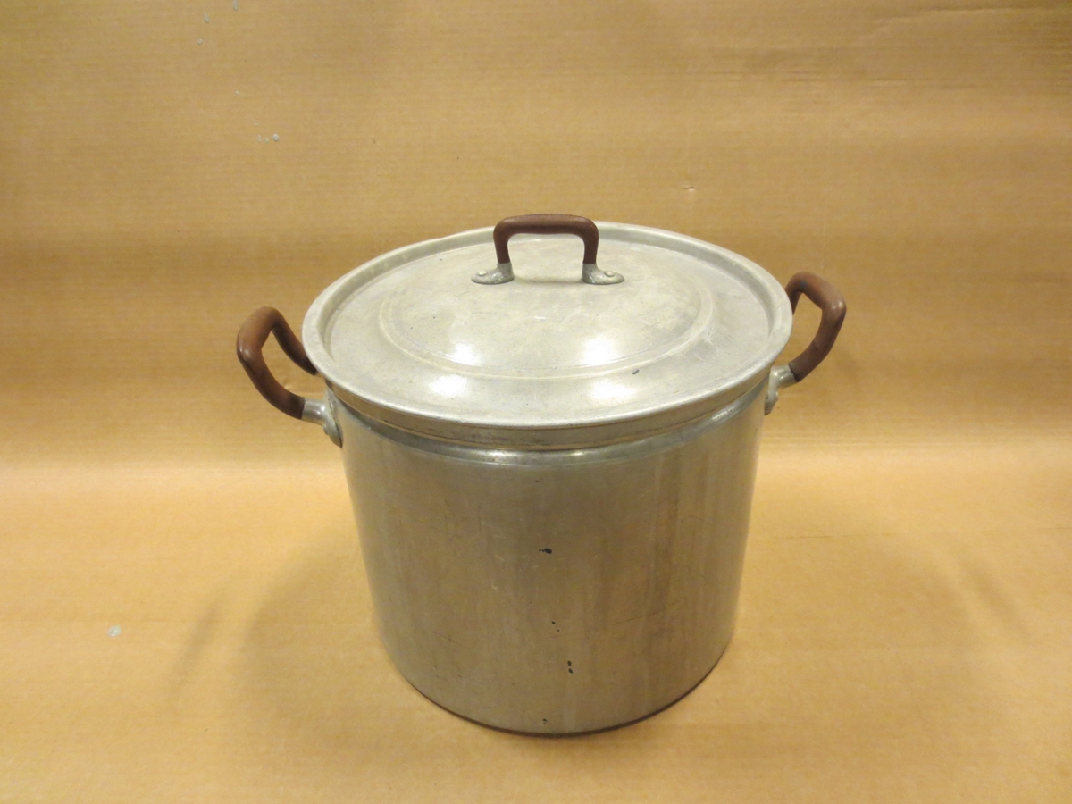 Pottur úr máli með brúnum höldum úr harðplasti. Eldhúspottur Önnu Þorkelsdóttur.