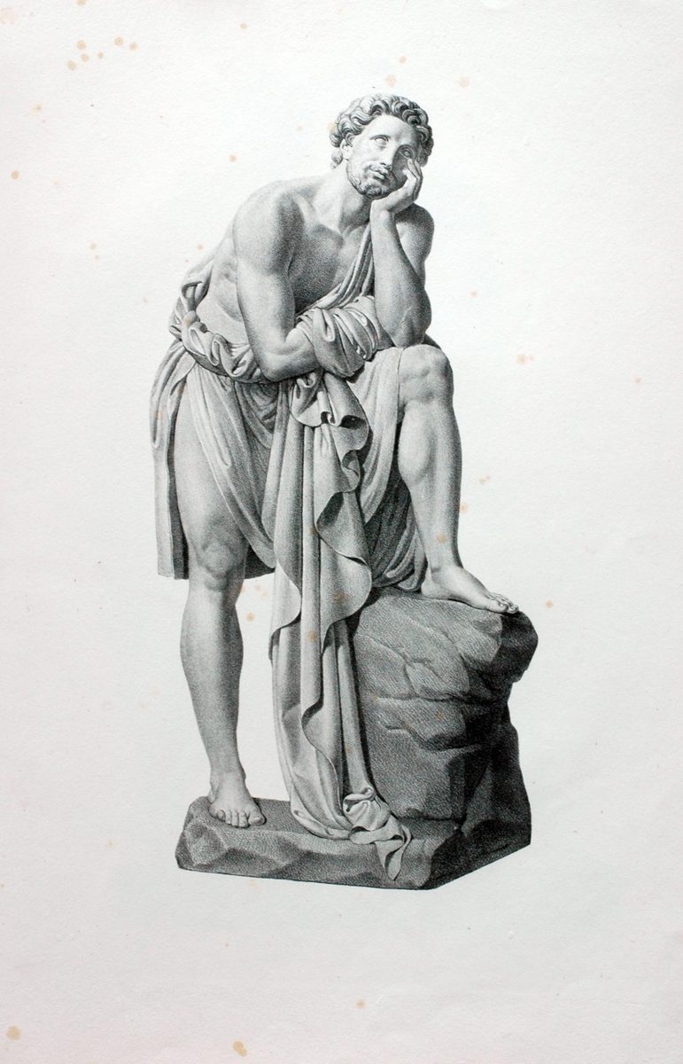 Del af serie litografier, inv.nr. E78a til E78m, udgivet som: "San Giovanni Battista che predica nel deserto. Frontone per una Chiesa di Copenhagen. Composta da Thorwaldsen. Lit. dall'Armi." Roma 1829