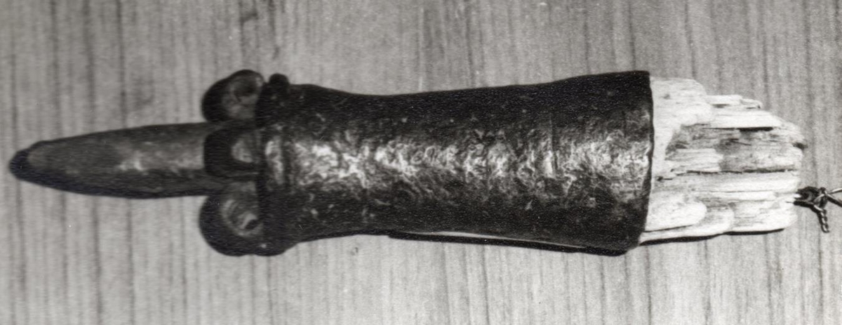 Broddstafur, skaftið brotið af. Lengd 16 cm. Koparhólkur, járnbroddur og fjórar járnfjaðrir. Hlut þennan gaf mér Guðjón Úlfarsson frá Fljótsdal, síðar bóndi í Vatnsdal. Sagði hann mér að stafinn hafi átt Jón Jónsson söðlasmiður frá Hlíðarendakoti. 16.8. 1958.