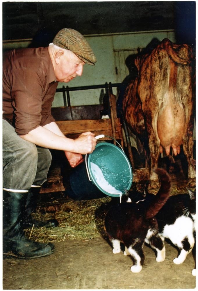 Vilhjálmur Hjálmarsson á Brekku við mjaltir. Aftan á myndinni stendur „Frá Mjóafirði - V.H. við mjaltir.“