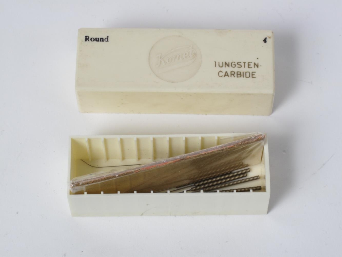 Kassi af tannrótarborum, notaðir til að hreinsa upp úr tannrótinni fyrir fyllingar.