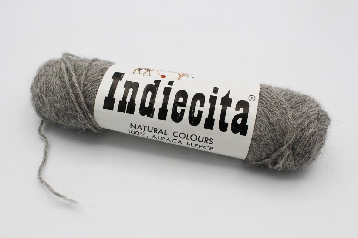 Hnykill með gráu garni. Pappahólkur utanum "Indiecita".