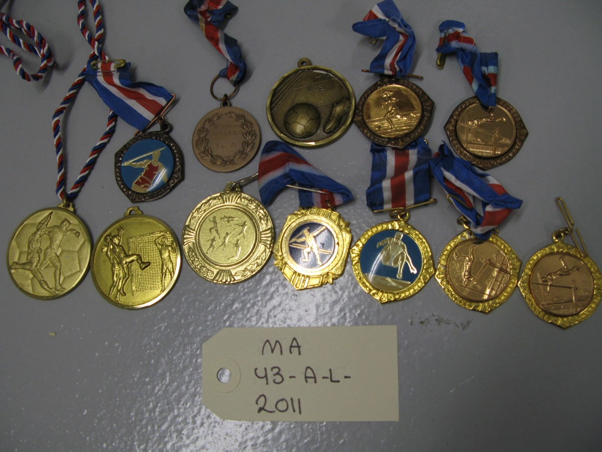 Tólf Ú.Í.A meistaramóts-verðlaunapeningar. Sjö gullitaðir og fimm bronslitaðir. (Merktir a,b,c,d,e,f,g,h,i,j,k,l).