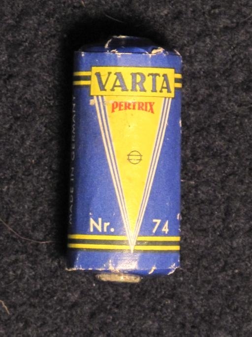 R15 volta rafhlaða merkt "PERTRIX" og "nr.74". Úr dánarbúi Steinvarar Bjarnheiðar Jónsdóttur og Guðmundar Þórðarsonar kennara á Seyðisfirði.