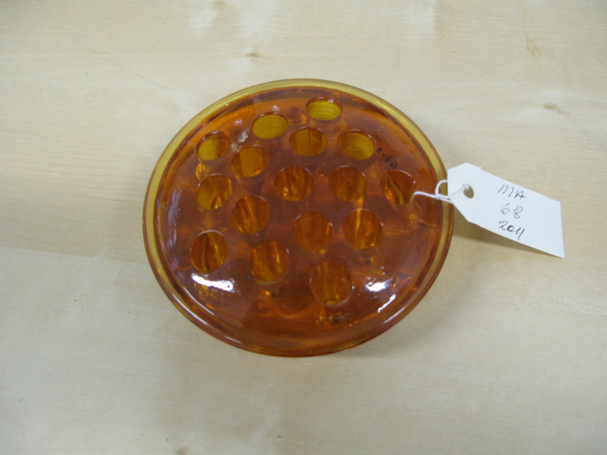 Kringlóttur glerklumpur með sextán kóniskum holum í; víðar efst en mjókka niður. Glerið er koníaksgullt á litinn. Þetta er hlutur til að hafa neðst í blómavasa eða skál og setja afskorin blóm í. Þegar sr. Þorgeir Jónsson, prestur á Eskifirði, flutti suður þá gaf hann gefanda, Vigdísi Júlíönu Björnsdóttur, þennan hlut. Það hefur verið um 1969.