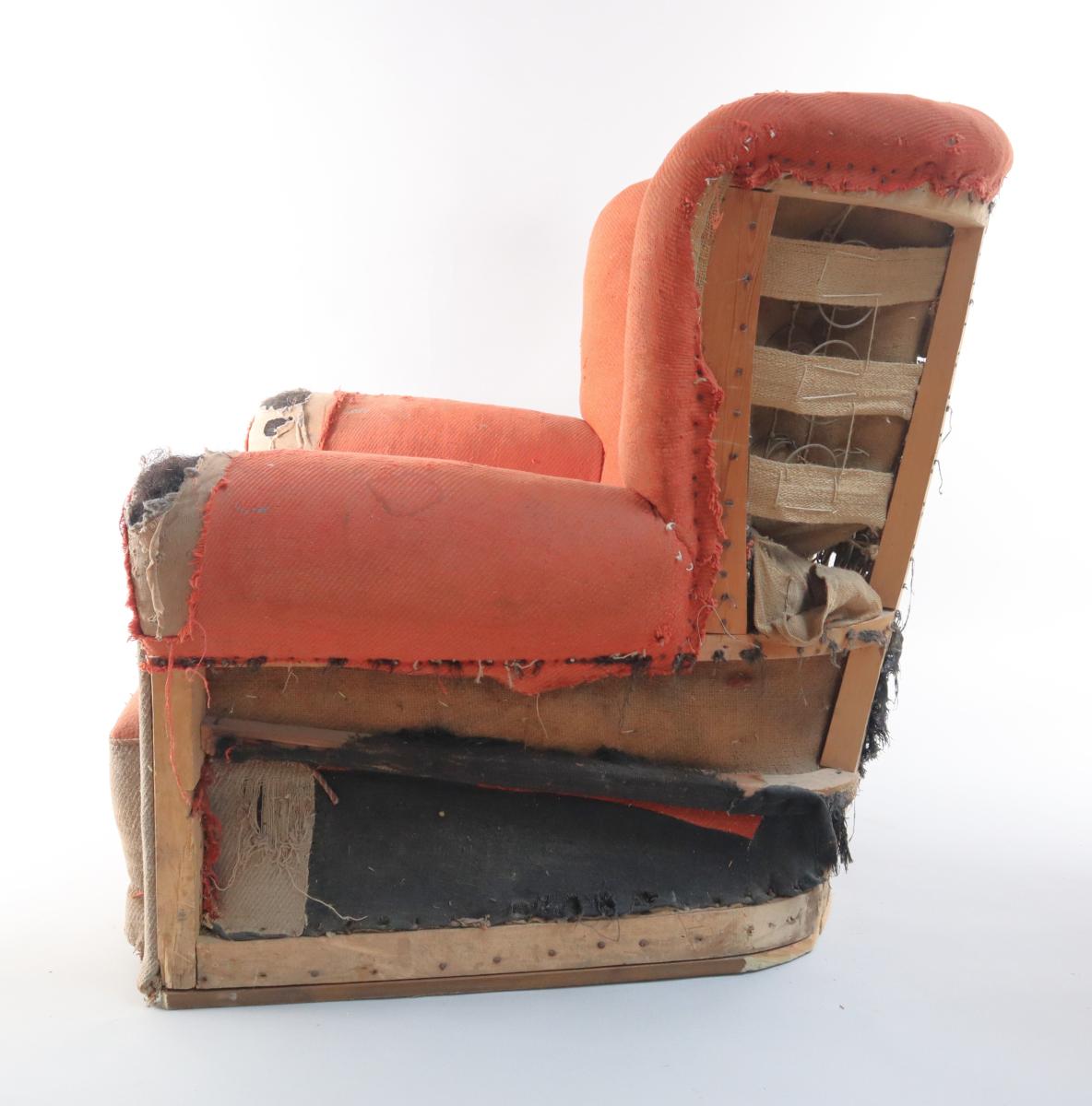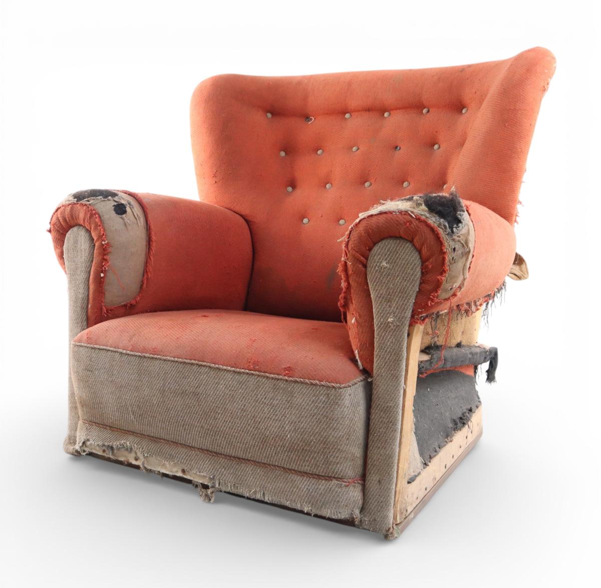 Hægindastóll Jóhanns "risa" Svarfdælings. Stóllinn var smíðaður fyrir Hótel Borg og var þar um árabil. Jóhann risi gisti á Hótel Borg þegar hann dvaldi í Reykjavík, hafði þar fast herbergi. Jóhannes Jósefsson, sá er byggði Hótel Borg, var vinur Jóhanns og velgjörðarmaður. Stóllinn, eins og vænta má, er engin smásmíði. Sessan sjálf er 70 cm. x 70.cm. Ástand hans er ekki gott í dag, en á bakhlið vantar alla klæðningu og áklæði hans, sem er appelsínugult og grátt, er orðið mjög slitið.