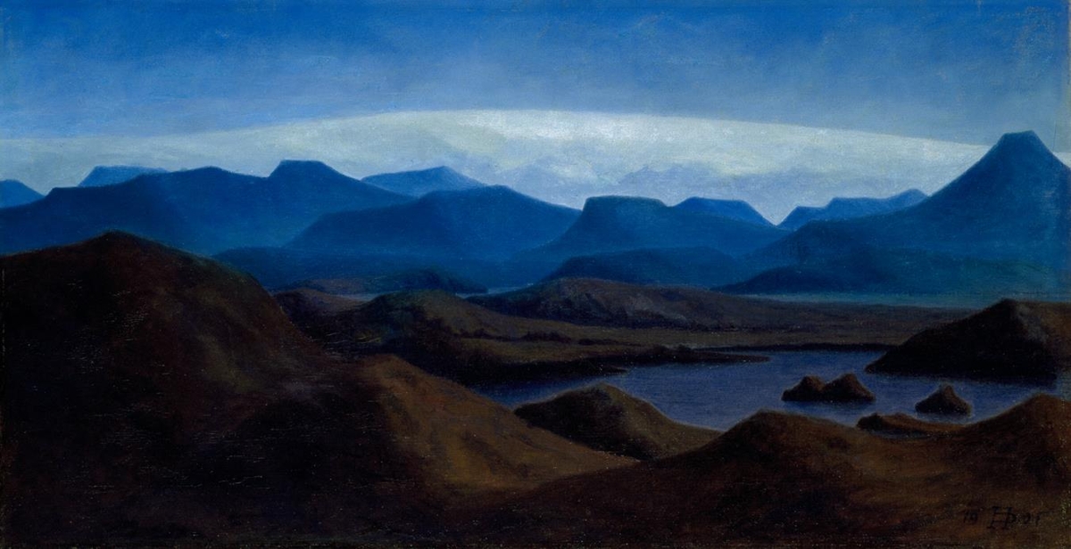 In 1900 Þórarinn held the first solo exhibition by an Icelandic painter in Iceland. In his paintings the land is often veiled with the cool light of summer nights; the reflection on the smooth surface of the lake enhances the air of tranquillity and instils in the spectator a sense of the sublime. Þórarinn based this painting of the sublime and bare landscape west of Vatnajökull on a drawing he made on his trip to Langisjór and into Veiðivötn in Landmannaafrétt in 1906. The visual structure is typical of Þórarinn´s works; the horizon is wide and the eye searches out the picture plane, passing step by step from the dark foreground to the blue mountains and over the bright rim of the glacier outlined against the sky.