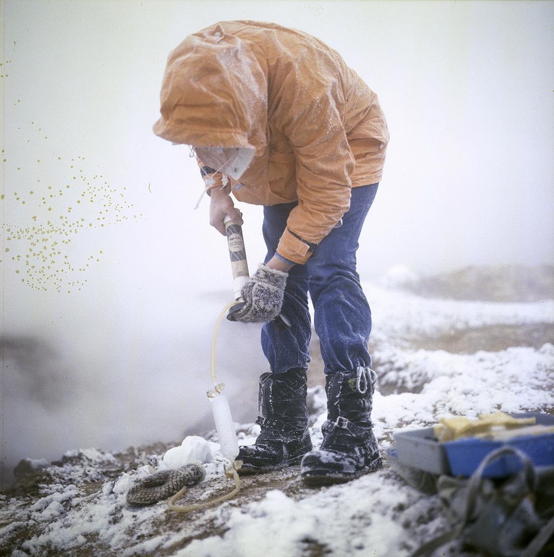 Guðmundur Sigvaldason, jarðfræðingur að taka gasprufur á Leirhnjúk og Hjörtur Tryggvason frá Orkustofnun.