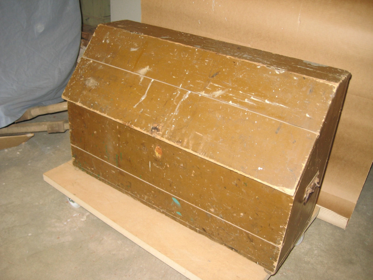 Smíðakista Guðmundar Sigurjónssonar, máluð brún með höldum úr málmi á hliðum. Lok í fláa og opnast þannig að úr verður flötur þar sem hægt er að leggja verkfæri. Einnig eru tvær skúffur við toppflöt aftan við lok fyrir minni muni svosem bora og fl.