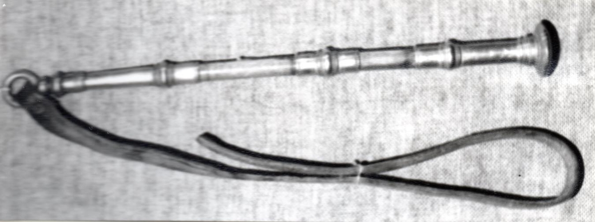 Karlmannssvipa merkt Sigmundur. Lengd 38 cm, húnninn 4 cm. Átt hefur Sigmundur Grímsson bóndi á Skarfsstöðum í Hvammssveit Dalasýslu, f. 30.9. 1839 d. 3.5. 1916. Svipuna gaf mér fóstursonur hans Sigmundur Ólafsson starfsmaður í Búnaðarbankanum.