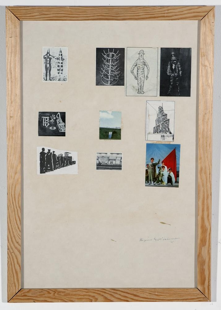 10 litlar myndir; 8 svarthvítar og 2 í lit: 2 myndir af drauga-fígúrum: 2 myndir tengdar kommúnisma; önnur í lit: 1 af íslensku landslagi; í lit: 1 mynd af neðanjarðarlest: 2 myndir af skúlptúrum: 1 mynd af röndóttum fígúrum: 1 mynd af óráðnum hlutUndirlag hefur gulnað, gæti verið það sama og bak ramma.