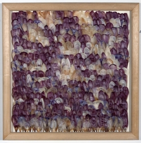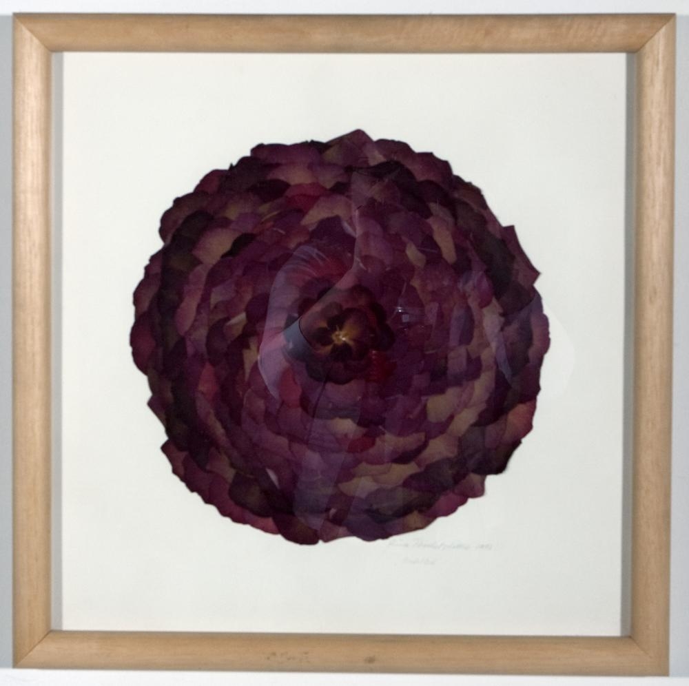 Eining 1: Án titils - Rósarblöð límd þétt saman á hvítt undirlag; mynda hring á miðjum myndfletinum. Eining 2: Untitled Tulips - Túlipanablöðum raðað þétt saman yfir allan myndflötinn. Rammar þykkir og ljósir; kúptir og ólitaðir; mögulega fura.