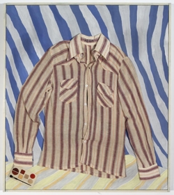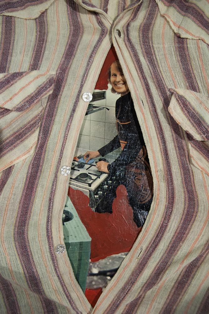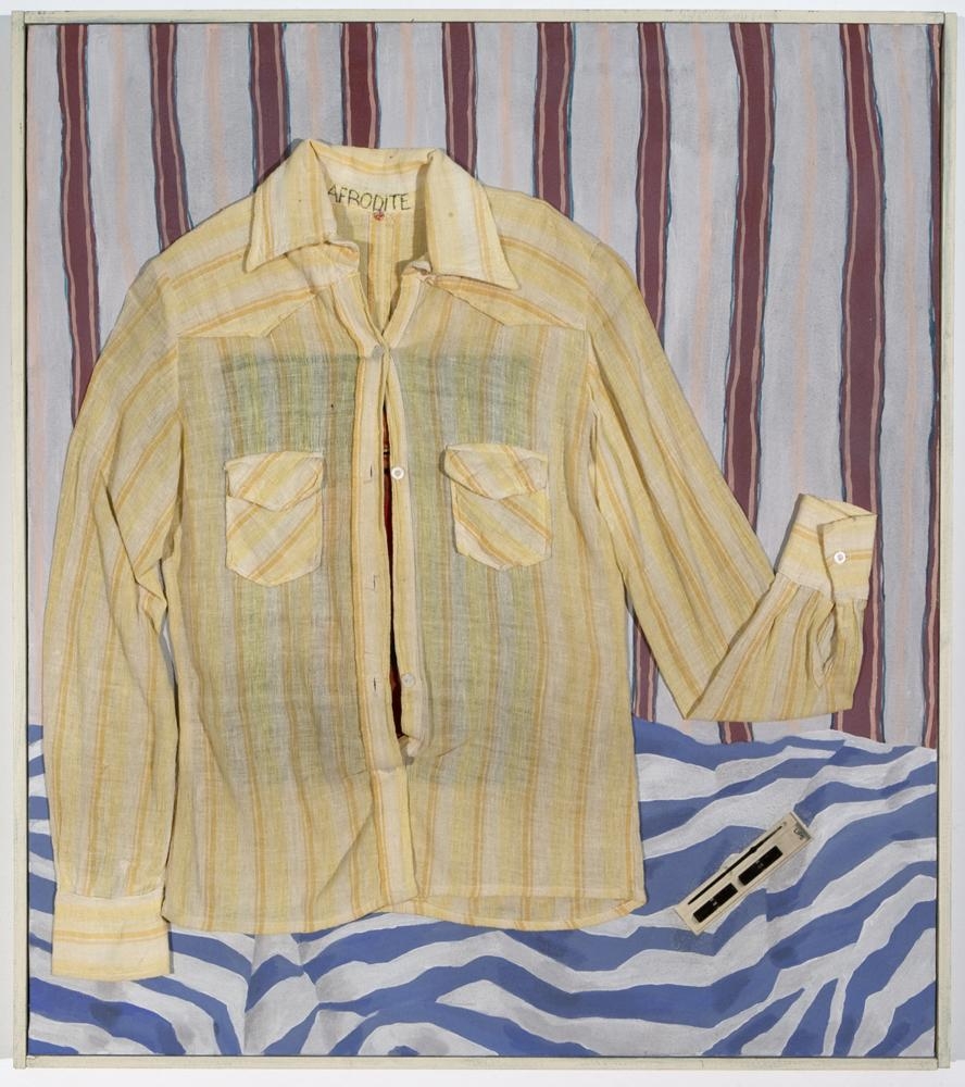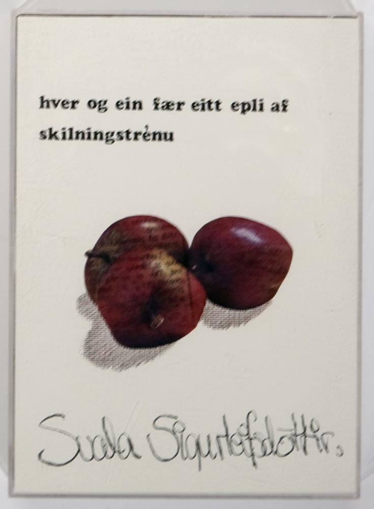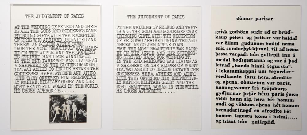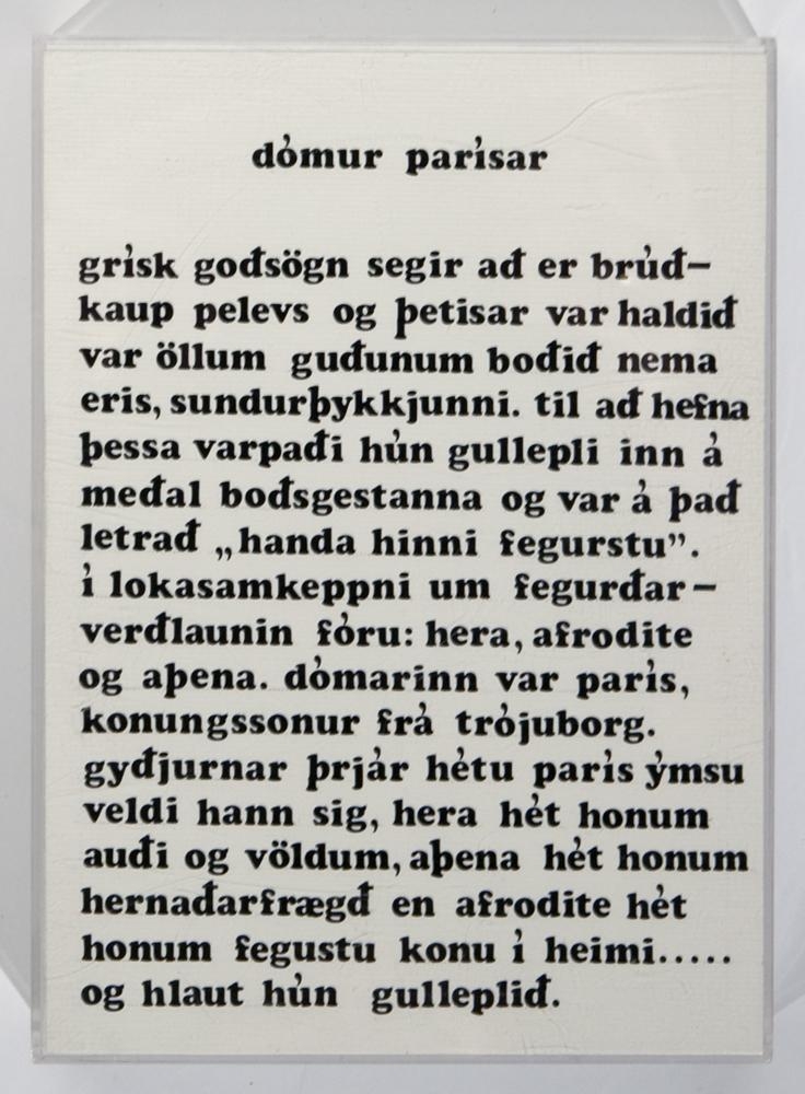 4 samklipp-málverk á striga: Samblanda af akrílmálningu á striga og samklippi. Þrjár einingar eru með náttskyrtu límdri á hvern myndflöt, inni í þeim eru pappírsúrklippur í lit - myndir af konum. Bakgrunnur er röndóttur og minnir á rúmföt. Í kraga skyrtanna er handskrifað með svörtum penna nöfn, eitt í hverri skyrtu: Aþena, Hera og Afrodite. Ein eining sýnir innantóm jakkaföt (þ.e. án hauss og handa, sést ofan í skyrtuna), með nafnspjald sem á stendur 'Mr. Paris'. Jakkafötin eru staðsett á panelklæddri skrifstofu. Grár skífusími fyrir framan jakkafötin og penni límdur inn á myndina við hlið símans. Fyrir aftan jakkafötin er litljósmynd af rollum á leið í réttir límd inn á myndflötinn. Rammar málaðir ljósir og negldir utan um strigana2 pappaöskjur með plastloki: ATH! Ekki til ljósmynd!!Önnur askjan er með svartan texta á vatnslitapappír: "hver og ein fær eitt epli af skilningstrénu". Fyrir neðan textann er klippimynd af rauðum eplumÍ hinni öskjunni er einnig prentaður svartur texti á hvítan vatnslitapappír - sagan um dóm Parísar í stuttu máli. Undir þeim pappír er tvö önnur blöð, annað sami vatnslitapappír en hitt mun þynnra. Á þynnra blaðinu er sami texti nema á ensku en á því þykkara er eftirprent af endurreisnarmálverki.
