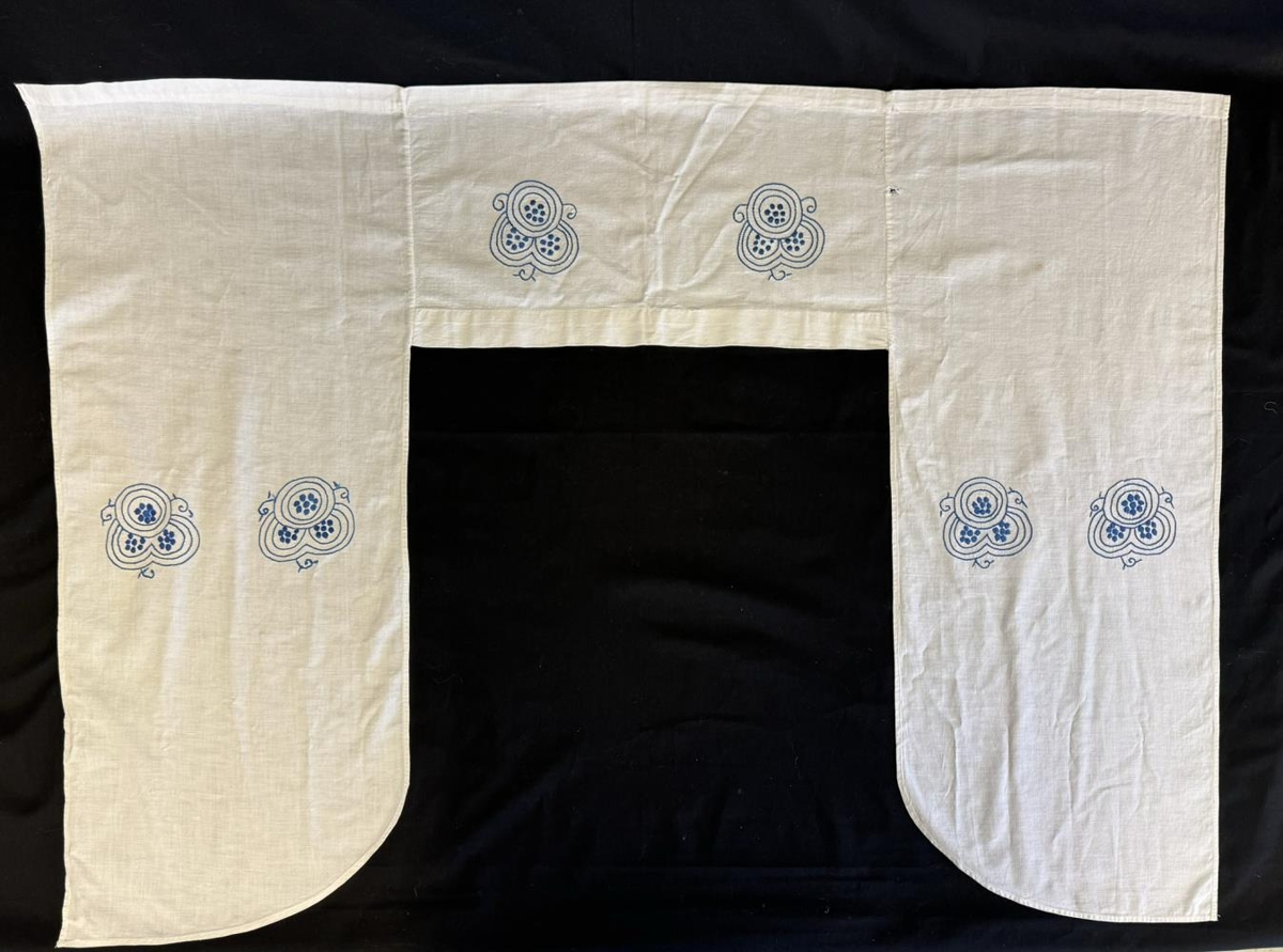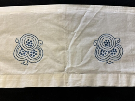 Puntuhandklæði? Veggstykki eða dúkur 111 cm á lengd allur en hliðarnar sem ganga niður eru 32 cm hvor fyrir sig á breidd - 76 á sídd. Blár útsaumur, einhverskonar hnútamunstur, tveir hnútar saman á hvorum væng og tveir fyrir miðju að ofan.