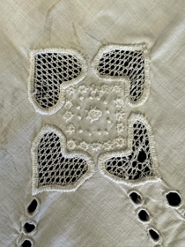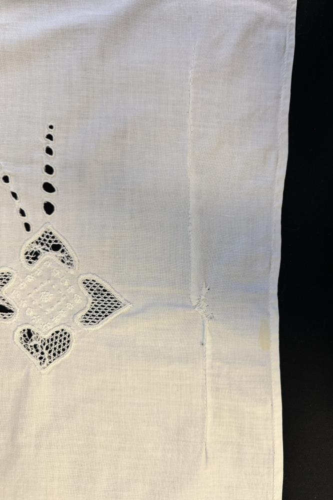 Puntuhandklæði, Útsaumaðir upphafsstafir E.S. Blómamunstur eins og sveigur fyrir miðju.
