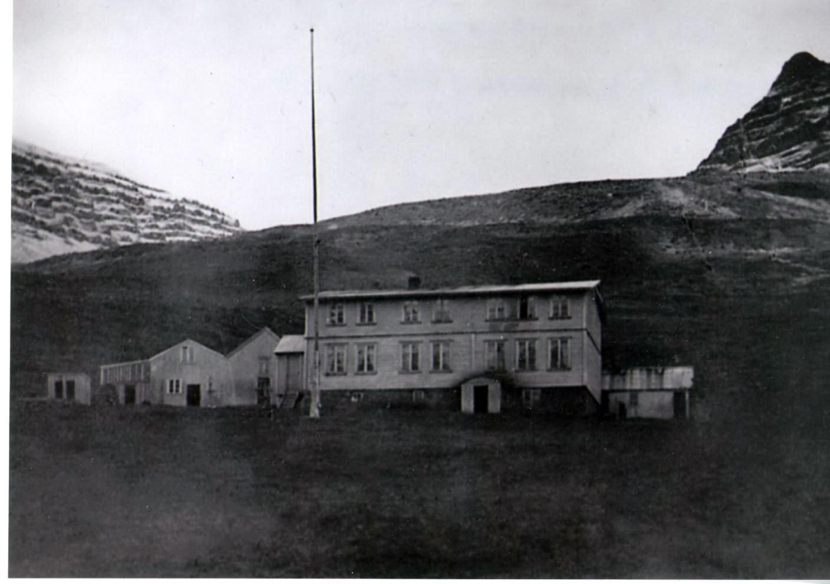 Tvílyft íbúðarhús úr timbri. Á bakvið sér á burstabæ og fleiri byggingar. Flaggstöng í forgrunni en fjöll í baksýn. Þetta er Brekka í Mjóafirði 1908, suðurhlið hússins.