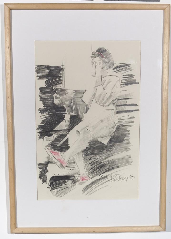 Blýantsteikning af sitjandi stúlku - stúlkan heldur fyrir vit sín og sveiflar fótunum. Bakgrunnur dökk abstrakt form. Stelpan er með dökkt stutt hár, í ljósum kjól, í rauðum skóm og með rauða hárspöngRúnaður ólitaður fururammi, bak úr bylgjupappa - brotinn og örlítið rifinn neðst í vinstra horni.