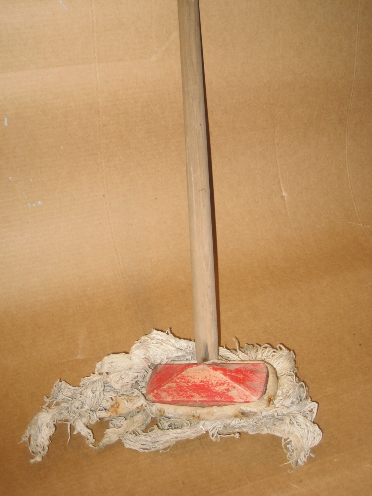 Kústur. Kústskaft með rauðlituðum haus sem aðeins farin að upplitast. Bómullarefni eða þræðir eru festir við hausinn.