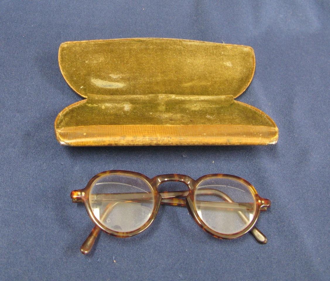 Gömul gleraugu, brúnyrjótt umgjörð og nærri kringlótt gler. Gleraugun eru geymd í járnhulstri sem lagt er fínköflóttu taui að utan en innan er mosagrænt flauel. Gætu líka tilheyrt foreldrum Ástu og Jóns.