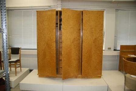Þrískiptur fataskápur með þremur sléttum hurðum. Hurðir og allir fletir að utan spónlagðir með birki (fuglsauga), að innan með aski (?). Í vinstri skáp eru tvær misháar fataslár úr viði og opið hólf úr samlímdum furuborðum. Í miðju skáp eru 3 hillur og 8 skúffur, allt úr furu (Oregon pine?). Í hægri skáp er ein hilla og fataslá úr viði, minni slá (fyrir belti, slifsi o.þ.h.) er innan á skápahurð. Hluti af svefnherbergissetti, úr búi Einars Sveinssonar (1906-1973), húsameistara Reykjavíkur og konu hans Vigdísar (Stellu) Reykdal (1911-1995). Svefnherbergishúsgögnin eru sennilega smíðuð fyrir 1940 en Einar og Stella giftust 1935. Í settinu eru 8 einingar: Hjónaúm með áföstum 2 náttborðum, vegghengt snyrtiborð, hringlaga spegill, klæðaskápur og tveir stólar, allt er spónlagt með "fuglsauga birkispæni". Framleiðandi er ókunnur.