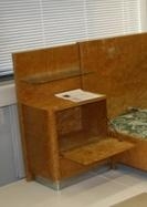 Náttborð (1 af 2) með áföstum gafli, allt úr spónlögðu birki (sennilega á gabon), hluti af svefnherbergissetti, úr búi Einars Sveinssonar (1906-1973), húsameistara Reykjavíkur og konu hans Vigdísar (Stellu) Reykdal (1911-1995). Náttborðið er með eina skúffu neðst og einu hólfi fyrir ofan með hurð sem opnast niður. Höldur úr krómuðu stálröri. Á áföstum gafli eru festingar fyrir glerhillu sem er með ávölum hornum. Svefnherbergishúsgögnin eru sennilega smíðuð fyrir 1940, en Einar og Stella giftust 1935. Í settinu eru 8 einingar: .Hjónaúm með áföstum 2 náttborðum, vegghengt snyrtiborð, hringlaga spegill, klæðaskápur og tveir stólar, allt er spónlagt með " fuglsauga birkispæni". Framleiðandi er ókunnur. Stærð: Gafl. H. 89 cm; Br 49,5 cm; D.3,5 cm. Náttborð: H 55,8 cm; Br. 48 cm; D. 30 cm. Glerhilla: Br. 42,5 cm; D. 20 cm.