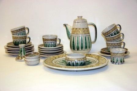 Bolli, einn af sex, úr sex manna kaffistelli úr renndum rauðleir, ljósdrapplitaður glerungur með handmáluðu svörtu, gulu og grænu skreyti í óhlutbundnum stíl. Frá Leirbrennslu Benedikts Guðmundssonar, Sjónarhóli v. Bústaðaveg, Reykjavík sem stofnsett var árið 1947. Áritað B.G. Ísland. Stærð: H. 6,7 cm; Þv. 6 cm - 8 cm.