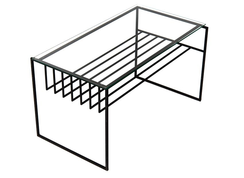 Sófaborð úr svartmáluðu járni með glerplötu.