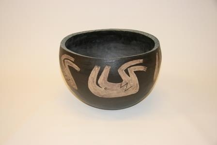 Stór skál unnin í jarðleir. Skálin er handmótuð með figurativu skreyti að utanverðu.
