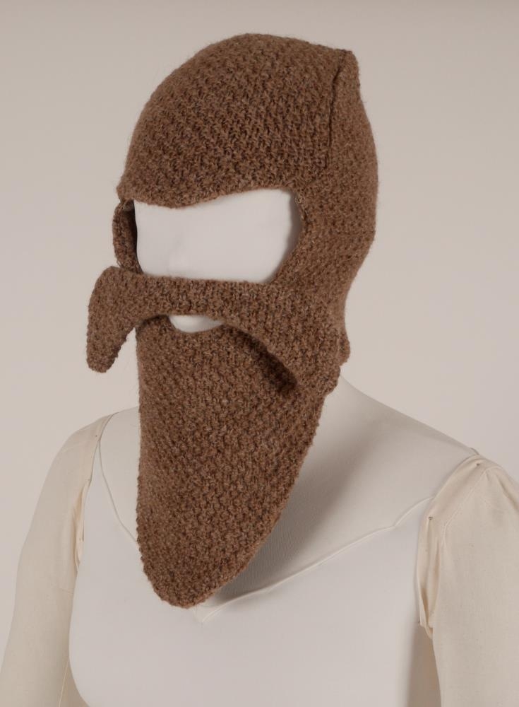 Húfa (lambhúshetta) með yfirvaraskeggi úr ljósbrúnu iðnaðarbandi frá Ístex, vélrpjónað í Víkurprjón, Vík í Mýrdal. Hönnun Vík Prjónsdóttir sem samanstendur af Agli Kalevi Karlssyni, Brynhildi Pálsdóttur, Hrafnkeli Birgissyni, Guðfinnu Mjöll Magnúsdóttur ásamt Þuríði Rós Sigurþórsdóttur.