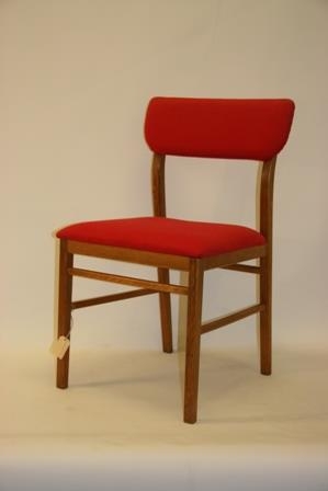 Einn af fjórum borðstofustólum, berandi hluti trégrindarinnar úr eik, seta og bak klædd rauðu ullaráklæði, ekki upprunalegt, Smíðaður á verkstæði Guðmundar og Jóns Benediktssona á Laufásvegi 18 og keyptur þar, sennilega um 1953. Úr gjöf barna Þórunnar Magnúsdóttur sagnfræðings til Hönnunarsafnsins í desember 2008.