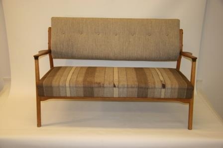 Tveggja sæta sófi, bekkur, berandi hluti trégrindarinnar úr eik, arrmar tekk, með ljósbrúnyrjóttu ullaráklæði. Áklæði ekki upprunalegt en var keypt hjá Vefstofu Guðrúnar Vigfúsdóttur. Smíðaður á verkstæði Guðmundar og Jóns Benediktssona á Laufásvegi 18 og keyptur þar, sennilega um 1953. Úr gjöf barna Þórunnar Magnúsdóttur sagnfræðings til Hönnunarsafnsins í desember 2008.