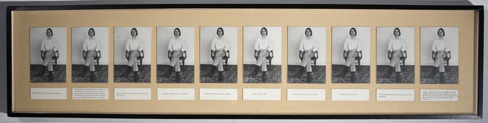Tíu svart hvítar ljósmyndir af listamanninum sjálfum sitjandi með krosslagðar fætur á stól sem og eru hendur hans krosslagðar sem hann hvílir á læri sér. Þessari tíu ljósmyndir virðast vera allt sama myndin, en í tíu upplögum. Fyrir neðan hverja mynd er þykkt pappaspjald (hvítt 3 x 9,5 cm), það er sem búið er að velrita boðorðin tíu á ensku, og er hvert boðorð undir hverri ljósmynd. Undirlag er gulur pappír, og bak er sennilega það sama. Ramminn er svart-málaður viðarrammi. Bak hans er stutt við rammann með viðarkubbum. Á baki rammans kemur fram hvar og hvenær verkið hefur verið sýnt. (sjá notkunarsögu) Það brakar í ramma, hugsanlega laust gler.