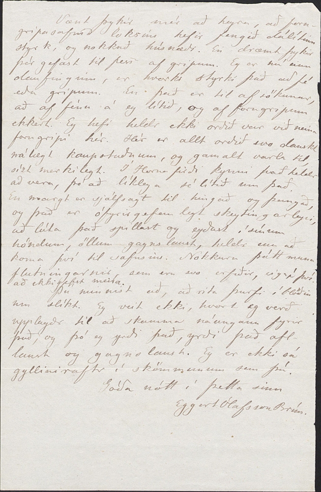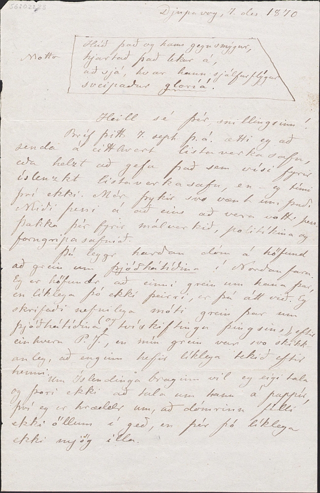 Bréf frá Eggert Ó. Briem, presti, Höskuldsstöðum. 13,9 x 21,6 cm. Dagsett 7.12.1870 Djúpavogi. Efni: Um blaðaskrif um þjóðhátíðina í Norðanfara. Forngripasafnið og söfnun muna til þess. Einnig er minnst á Íslendingabraginn. Bréfið hefst á mottói í vísuformi. Tvö umslög fylgja bréfum Eggerts.