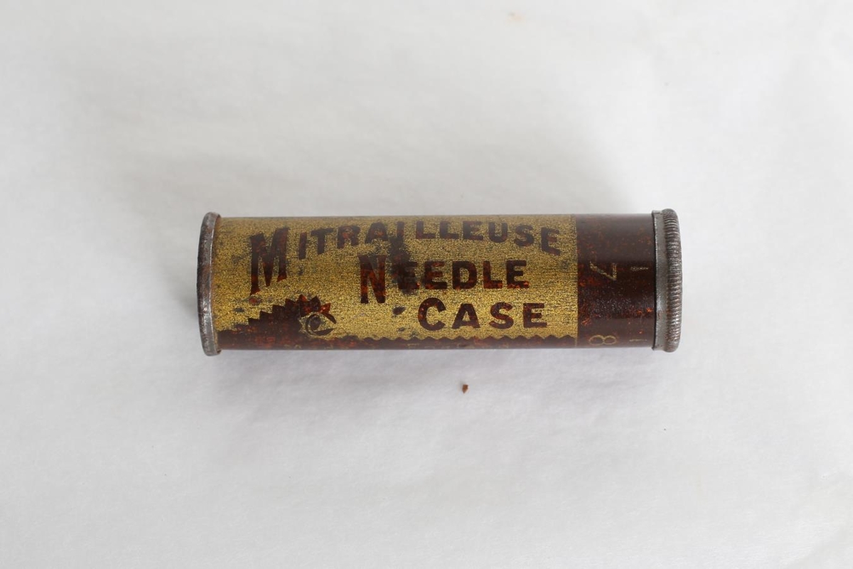 Lítill brúnleitur járnstaukur sem er fullur af saumnálum með númerum frá 4 til 8. Staukurinn er lokaður og aðeins lítið gat á öðrum enda hans þannig að hægt er að snúa lokinu og þá vísar hak á því á númerið sem er á nálinni sem þar er undir. Áletrun á stauknum er; "Mitraliheuse Nedle Case. Made in England".