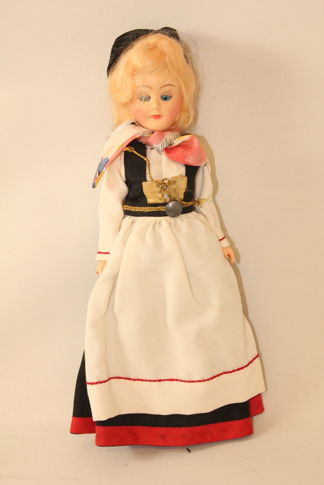 Brúða frá 1956. Þjóðbúningadúkka. Er í mjög einfölduðum upphlut með skotthúfu og svuntu.