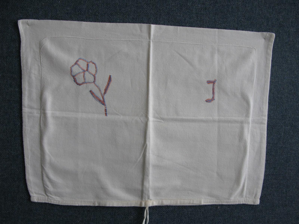 Hvítt heimasaumað koddaver með vélsaumaðri rós hægra megin og bókstafnum J vinstra megin. Litir í zik-zak saumnum eru bláir og appelsínugulir. Tilheyrði Jóni Kristberg, bróður Ástu.