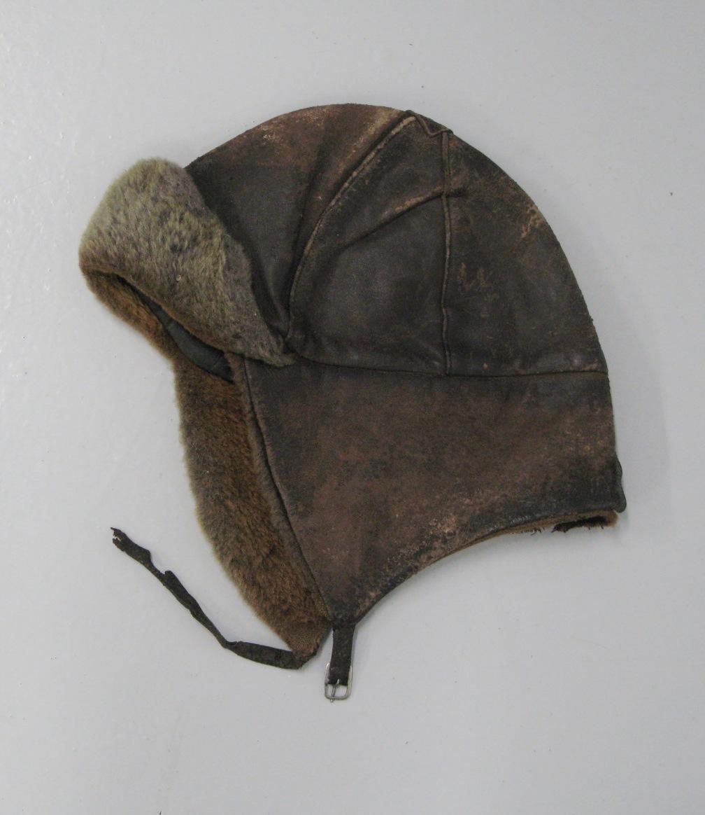 Brún leðurhúfa með loðkanti á skyggni og fyrir eyrum og á hálsi. Svona húfur voru algengar eftir stríð. Var í eigu Jóns Erlendssonar.