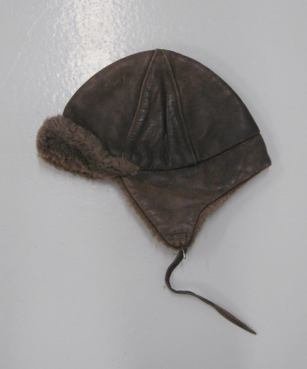 Brún leðurhúfa með loðskinni á skyggni og f. eyrum og á hálsi. Var algeng eftir stríð. Var í eigu Jóns Erlendssonar.