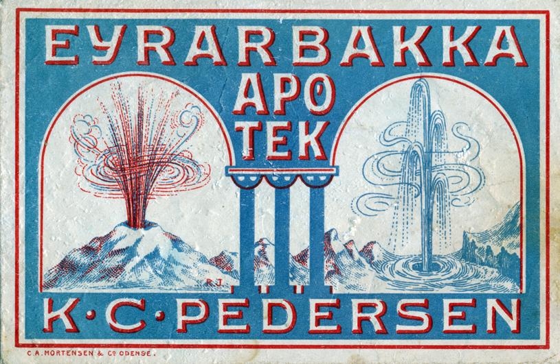 Fallega skreytt umslag frá Eyrarbakkapóteki. Mynd af eldfjalli og svo af goshver. Undir mynd stendur "K.C: Pedersen"