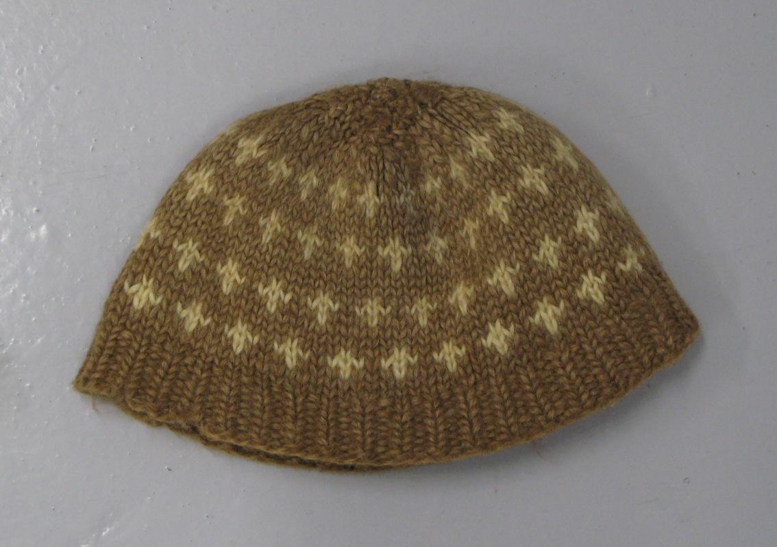 Útprjónuð mórauð húfa með hvítum stjörnum. Var í eigu Jóns Kristbergs Erlendssonar, en prjónuð af Ástu Erlendsdóttur.